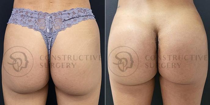 On the other hand, fat transfer to the buttocks involves removing fat from other areas of the body, such as the hips or thighs, through liposuction and transferring it to the buttocks. While this procedure can create a more natural look and feel, the amount of fat that can be transferred is limited, which can limit the amount of augmentation possible and in thin patients may not achieve the optimal result desired.